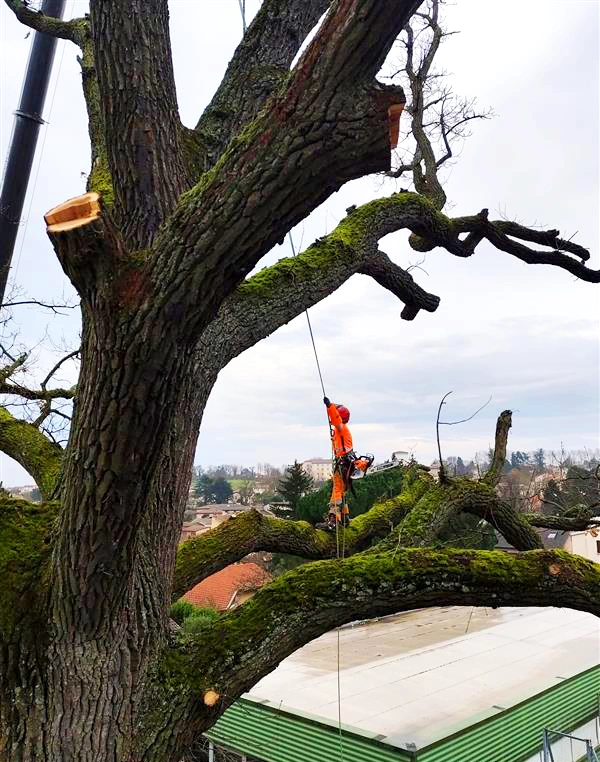 Nos équipes d’élagueurs sont intervenues au cœur de la ville de Charly pour sécuriser un chêne centenaire présentant des signes de faiblesse, tout en valorisant le bois récupéré. Un chantier délicat où sécurité, technicité et durabilité se rencontrent.